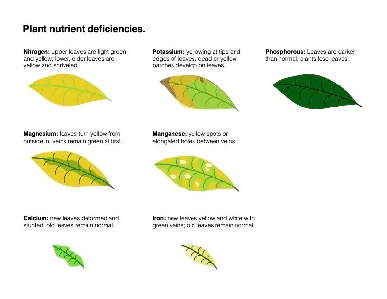 The image above shows how common nutrient deficiencies can appear. However, similar symptoms can also be caused by over- or under-watering, soil compaction, incorrect pH, insects, and other factors. A proper soil test is the best way to confirm whether fertilizing is recommended.